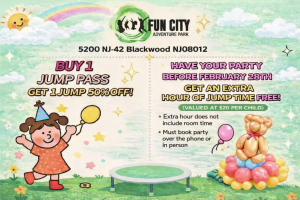 Jump into Fun City! All ages welcome. We are Blackwood's one stop Family Entertainment Center with Over 20 Arcade Machines, Trampoline Courts, Ninja Course, Dodgeball, Basketball, Playground, Battle Beam, Foam Pit, Bumper Ball, Parkour, Airbag and more!